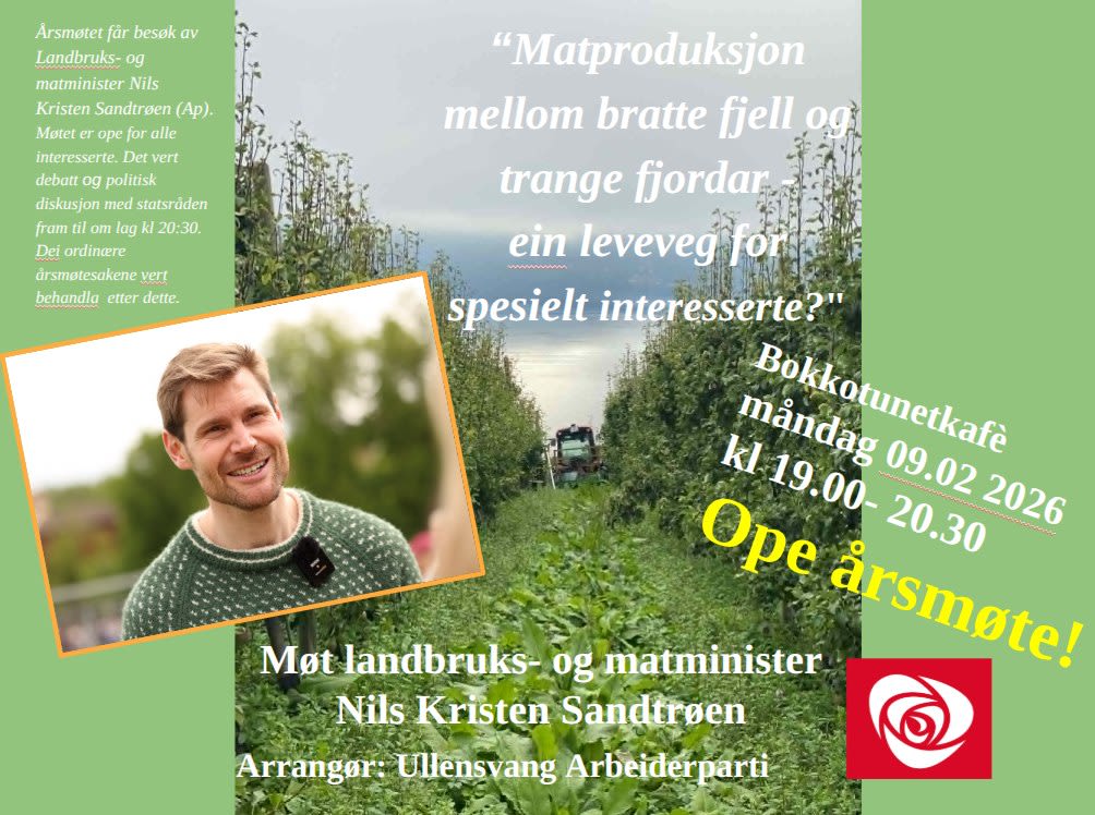Årsmøtet får besøk av Landbruks- og matminister Nils Kristen Sandtrøen (Ap). Møtet er ope for alle interesserte. Det vert debatt og politisk diskusjon med statsråden fram til om lag kl 20:30. Det dei ordinære årsmøtesakene vert etter dette.